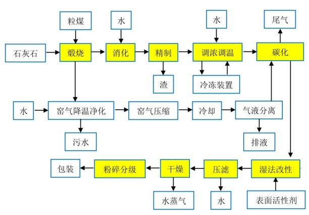 工业上一般采用碳化法生产轻质碳酸钙,碳化法中的碳化反应体系是一个气-液-固三相体系,主要包括以下几个工段:(1)煅烧:石灰与煤按一定比例混合均匀后经混料竖窑煅烧,产生氧化钙、二氧化碳;(2)消化:煅烧石灰除渣后进入消化池与水进行消化反应生成石灰乳,并进行精制;(3)碳化:石灰乳精制后在一定温度和浓度下与窑气进行碳化反应;(4)脱水、干燥、分级:压滤机脱水、干燥、粉碎分级和包装。